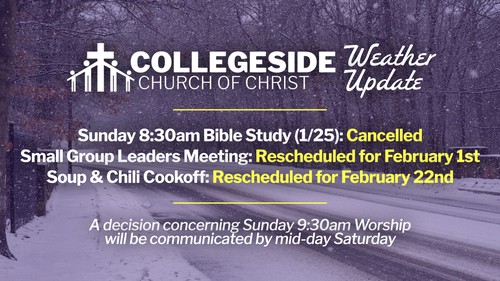 We know there is some uncertainty about what precipitation our area will receive. Based on information we've received from county officials, we will cancel all Sunday 8:30 am Bible classes this Sunday, January 25. We will also reschedule the Chili and Soup night, scheduled for Sunday night, to February 22. Since there are no Bible classes, the Small Group leaders meeting will take place on Sunday, February 1.